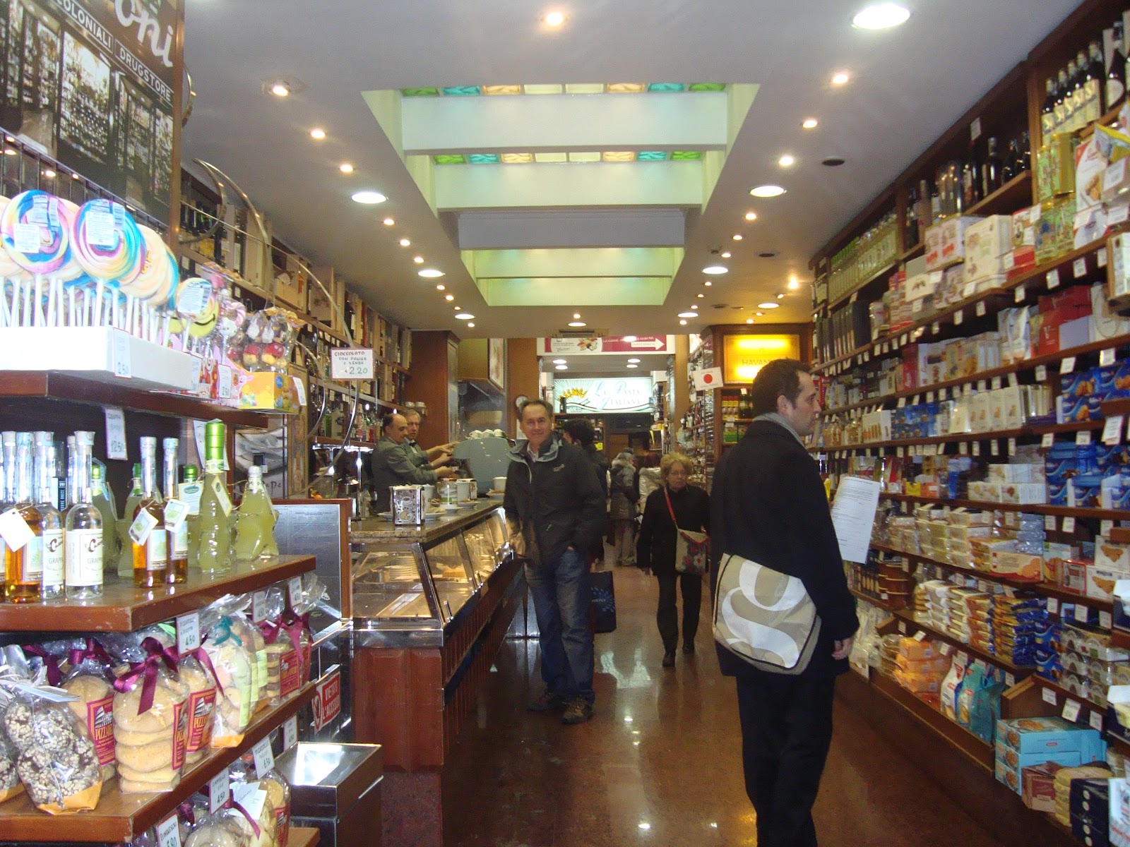 Esta tarde, ya en Barajas, compramos Él País y El Mundo para leerlos en el vuelo de regreso a Vigo. No deja de sorprenderme la divergente forma de transmitir la actualidad que tienen los medios. Dentro de un rato bucearé en los diarios digitales de diverso signo para intentar hacerme una idea lo más aproximada posible a la realidad, pero antes voy a preparar unas alcachofas preciosas que he comprado en un puesto callejero de Roma, que ayer tarde todavía nos dio tiempo de callejear y no pude resistir la tentación. Me hubiera gustado traerme alguna cosa más, sobre todo de una tienda de Via Cola di Rienzo que me encantó, es la de las fotografías. Tiene un nombre algo feo, "Castroni", pero es una delicia ver sus pasillos con estanterías llenas de mermeladas, conservas y golosinas, con los empleados vestidos de mandilón marrón al estilo de los antiguos coloniales. Junto a este colmado hay una charcutería con productos locales exquisitos a un precio muy razonable.